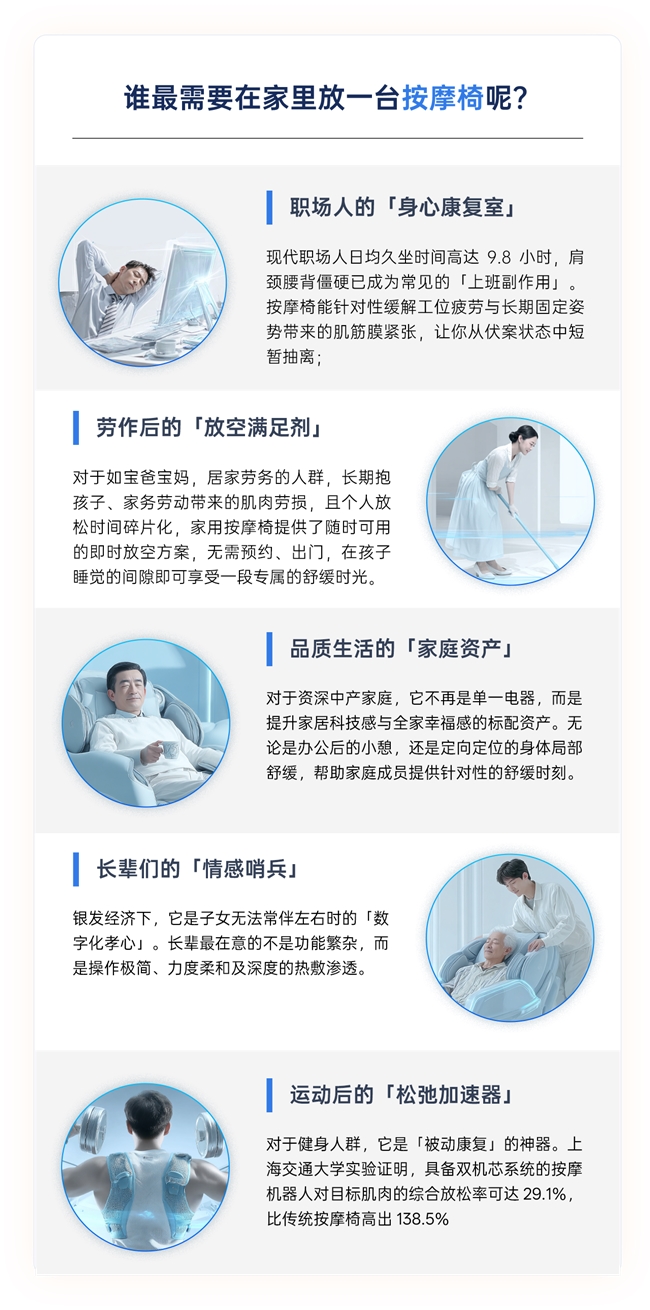 由此可见,人们对按摩椅的各方面,仍存在着或多或少的疑惑,更对它的作用、体验和选购充满迷茫。其中首当其冲的,就是许多人对按摩椅是「智商税」的质疑。接下来,我们带你一点点去了解按摩椅到底是一种怎样的存在。