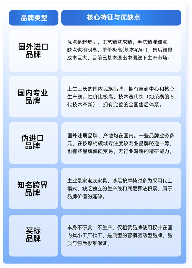 按摩椅市场并非只有进口和国产之分。根据品牌的研发背景和生产模式,我们可以将其划分为五大类型。认清这张图表,能帮你过滤掉 90% 的营销套路——