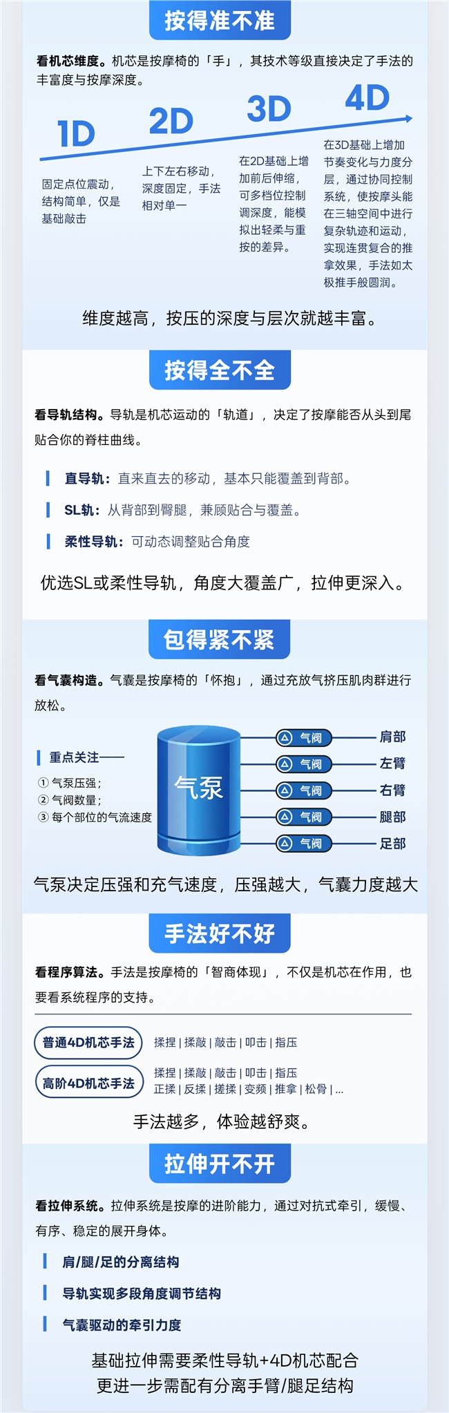 对大部分消费者而言,选购按摩椅的出发点是缓解疲劳、放松肌肉,或者希望能对身体的腰背腿等某个部位做定向的舒缓,长期改善身体紧张状态。总结起来就是「按得准不准、按得全不全、包得紧不紧,以及手法好不好,是否能够拉伸展开」,但往往简单的需求却被陌生的参数信息搞得一头雾水,通过下图,让我们快速了解哪些硬件决定着一台按摩椅的手法与效用。