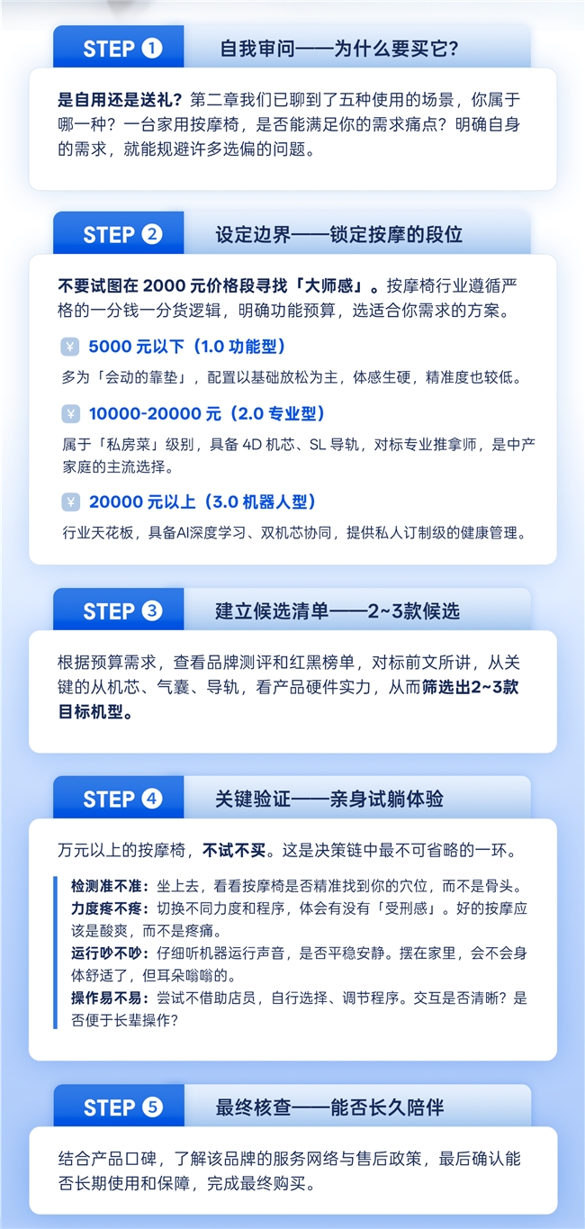 ❌ 忽略体型检测与程序可调性:再贵的按摩椅,若无法精准适配您的身高体型,或程序力度手法不可调,都可能导致按得不舒服。线下试躺是检验的唯一标准。