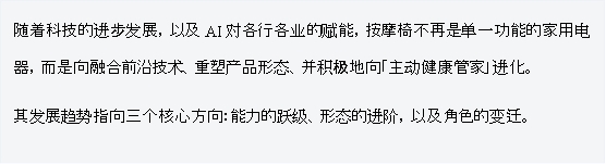 AI与具身智能共同演绎了软硬件结合的迅猛发展,落在按摩椅行业,更是推动家庭健康护理迈向智能化、标准化新时代。
