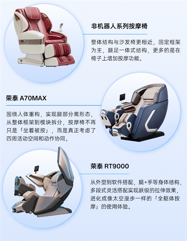 如果说过去的按摩椅是「手动挡」,你按什么它动什么;现在的标杆则是「自动驾驶」。随着技术跃迁,行业正从机械执行到AI感知与决策,从简单的物理位移模拟,转向基于生物传感的深度交互不断发展前进。在以荣泰为代表的研究下,产品形态正在向两个发展路径展开——