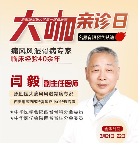 为进一步满足广大患者的就诊需求,让更多病患在家门口就能享受军级三甲医院级别的优质诊疗服务,西安附医中医医院3月21日—3月22日特邀原第四军医大学专家闫毅教授莅临亲诊,强强联合,为痛风、风湿骨病及各类疑难病症患者提供一对一精准诊疗,用高超医术与专业方案,为健康保驾护航。