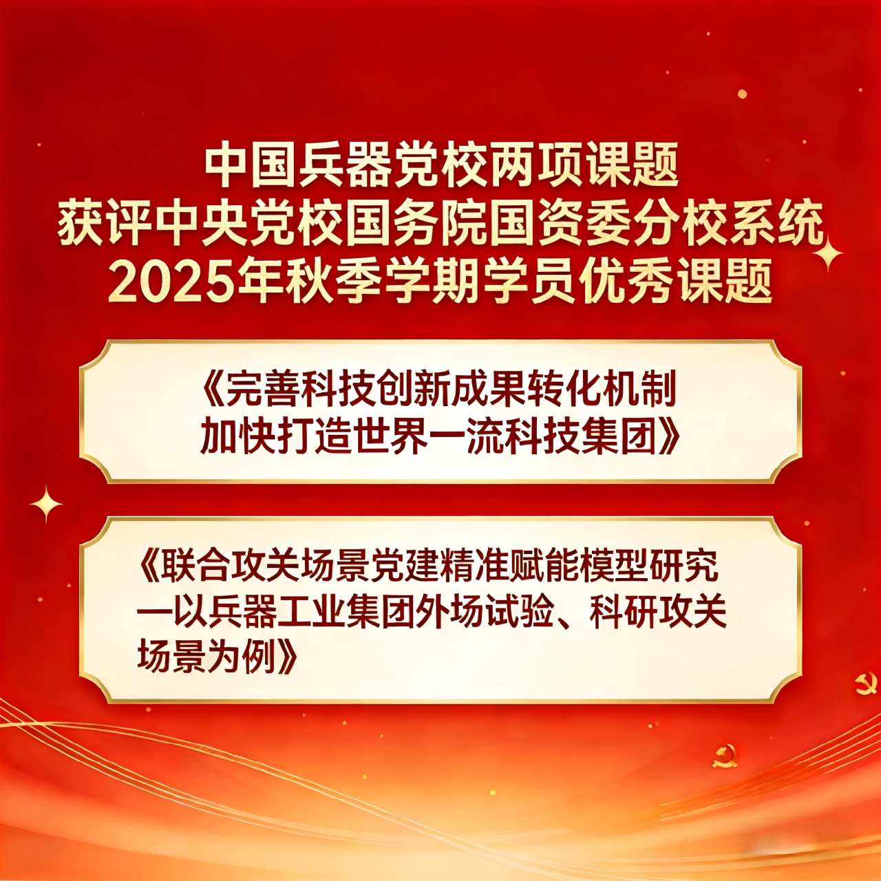 近日,中央党校国务院国资委分校公布分校系统2025年秋季学期学员优秀课题名单,共有18家央企党校的34项课题入选,其中兵器党校2项。