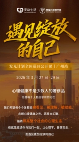 2026 年 3 月 27 日至 29 日,由灵动生活旗下幸福心理商苑发起的 “发光者计划” 全国巡回公开课将登陆广州,以 “遇见绽放的自己” 为主题,邀请知名畅销书作家张德芬、《唤醒财富脑》作者陈芳谊、中德舞动治疗师冯与兮三位导师,共同探索从身体智慧到内在财富、再到自我绽放的成长路径。