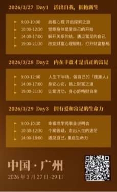第一天聚焦身心连接,通过觉察身体信号、释放积压情绪,建立起自我关怀的基础能力,为后续的认知突破打下生理与心理的双重根基;第二天转向认知升级,通过拆解限制性信念、重建内在秩序,将内心的稳定感转化为对财富和人生的清晰掌控力,实现从 “匮乏感” 到 “富足感” 的底层逻辑转换;第三天完成整合落地,从事业路径规划到个人困惑解答,将前两天的觉察与突破转化为可执行的行动方案,最终实现自我认知的清晰化与生命力量的重启。
