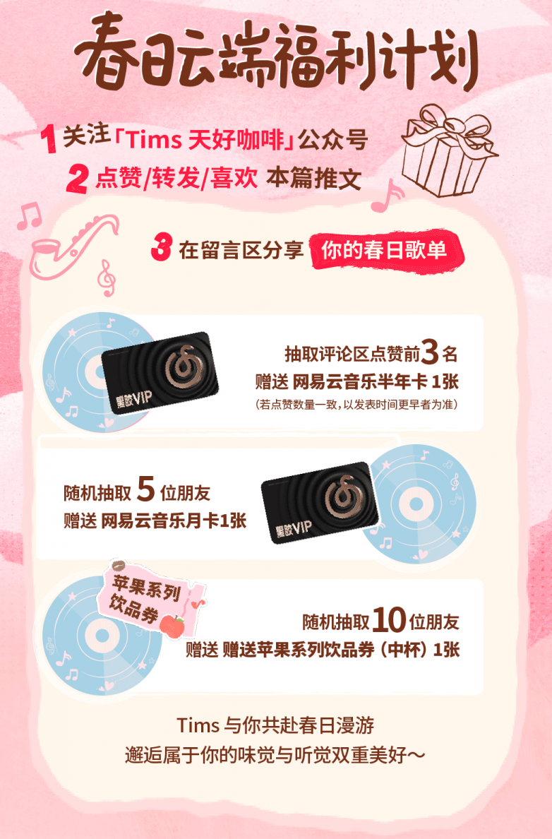 参与抽奖活动,即有机会解锁网易云黑胶VIP(随机天数),让美味时光总有音乐相伴;或者赢取苹果系列免单券、满减券、指定饮品买一赠一、网易云音质卡、网易云周边、云贝等随机好礼。另外,关注「Tims天好咖啡」公众号,在相应活动推文下点赞、转发或喜欢,并在评论区分享你的“春日歌单”,即有机会从精选留言中脱颖而出,拿下好礼。