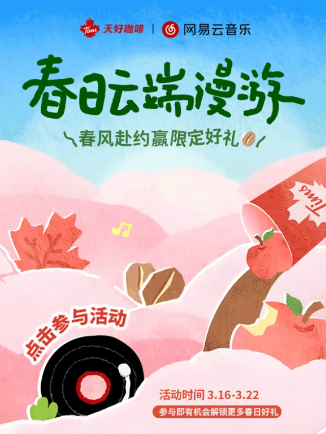 好喝的饮品、好听的音乐,自然要配上好玩的活动。3月16日至3月22日,Tims天好咖啡联手网易云音乐开启“春日云端福利计划”,为这个春天增添更多的惊喜。