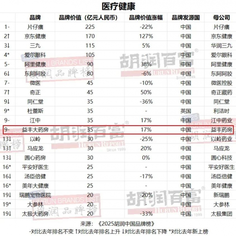 在品牌价值日益成为企业核心竞争力的今天,入选权威榜单不仅是市场对企业过往耕耘的认可,更是综合实力与行业地位的有力印证。日前,益丰大药房(以下简称“益丰”)在《2025胡润中国品牌榜》中实现“双榜突破”。企业以35亿元品牌价值位列总榜第290名,同时在“医疗健康”领域子榜单中高居第9名,成为排名最靠前的专业药店连锁品牌。