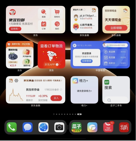 ·京东卡片:商城、百亿补贴、物流状态都摆上桌面。想查件看一眼,想省钱点一下。