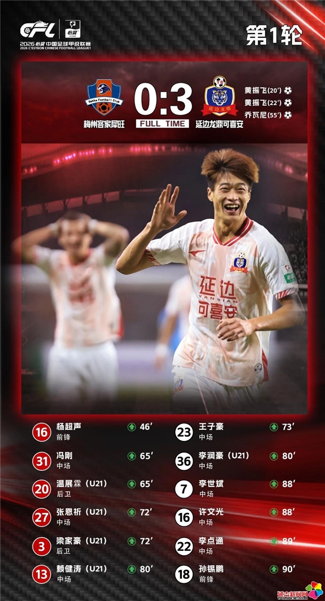 绿茵燃情,捷报传扬!3月14日19时30分,2026怡宝中国足球甲级联赛第一轮焦点对决在梅州五华县惠堂体育场正式落幕,延边龙鼎可喜安队客场挑战梅州客家犀旺队,凭借黄振飞的梅开二度与乔瓦尼的精彩破门,以3:0的悬殊比分完胜对手,稳稳斩获新赛季开门红,用一场酣畅淋漓的胜利,为全年冲超目标奠定坚实基础,也让全国球迷见证了“足球之乡”的奋进力量。作为球队独家冠名方,可喜安与延边龙鼎同心同向、并肩前行,在见证这份荣耀的同时,也将品牌坚守与拼搏精神,深深镌刻在中甲赛场的每一寸绿茵之上,书写着本土民族品牌与本土体育事业双向赋能、共生共赢的崭新篇章。