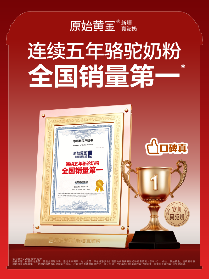 数据来源:尚普咨询集团,覆盖全渠道市场,通过专家及企业调研,对比全国(不包括港澳台)范围内各品牌骆驼奶粉销售情况(以吨计),得出:原始黄金,连续五年骆驼奶粉全国销量第一;骆驼奶粉特指以骆驼乳为原料,经过加工制成的粉状产品。统计时间:2021年1月1日至2025年12月31日;本声明于2026年1月完成调研。