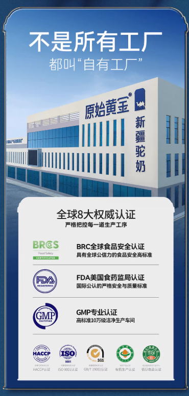 高标准的认证,是驼奶粉品质的硬核背书。作为中国首个SGS认证产品品质达欧盟标准的驼奶品牌[3],原始黄金的驼奶粉执行超923项严苛质量检测标准,从微生物指标到营养成分含量,从原料溯源到驼奶粉成品出厂,每一个环节都精准可控,更顺利通过HACCP、GMP、ISO、英国BRC及美国FDA等多项国际权威认证。从天山特级产区的天然奶源,到最快2小时鲜乳可直达的新鲜守护,再到国际标准的品控体系,原始黄金以全链条的坚守,让每一勺驼奶粉都承载着新疆真驼奶的品质精髓。