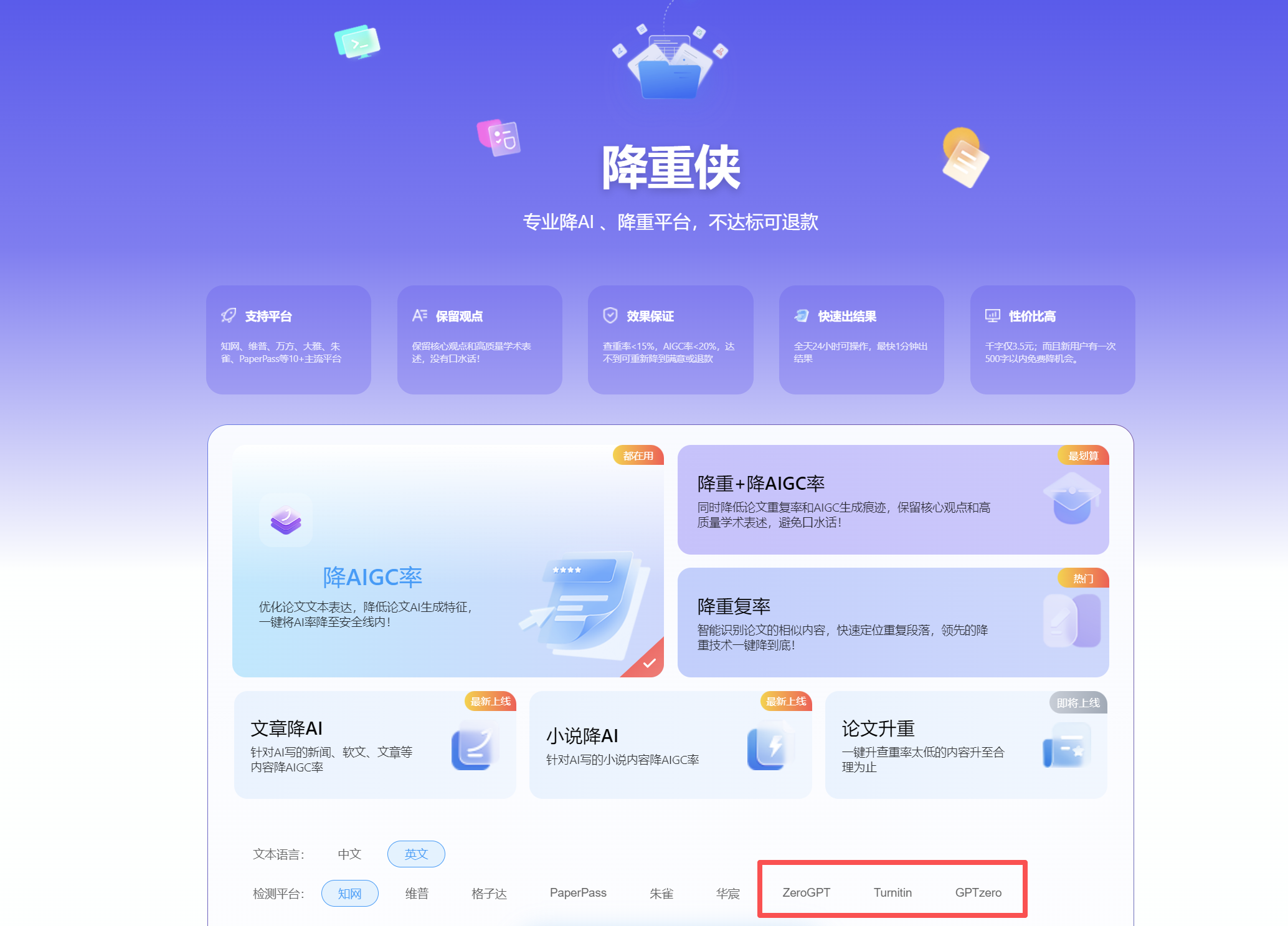 回到大家最关心的问题:降英文 AI 率哪个工具最好?真正帮你把 AI 率降到合格线、完美适配三大平台检测、还能保住文本质量的,就是我亲测无数次的降重侠 AI。