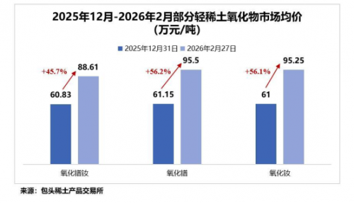 自2025年10月底起,氧化镨钕价格从50万元/吨开启上行通道,2026年2月一度攀升至90万元/吨附近。此后价格有所回落,随着市场情绪逐步消化和理性回归,至3月6日,氧化镨钕主流成交价格已再度回升至85万元/吨附近,进一步印证了其价格底部的支撑力度与市场长期信心。
