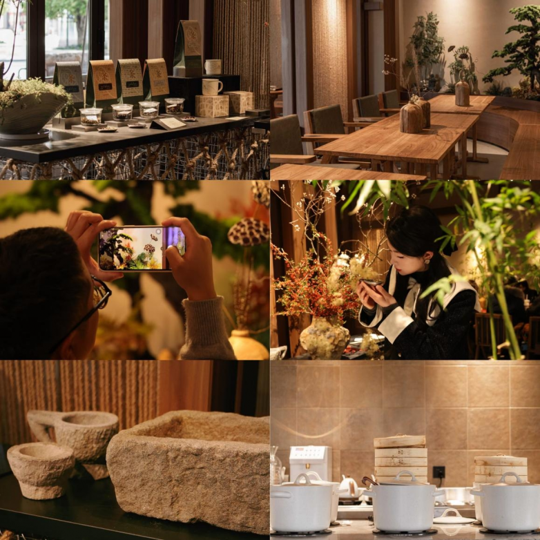 一心手作的门店,无意追逐时下流行的极简冷淡风。实木长桌、复古花瓶、陶瓷砂锅、充满生机的绿植……这间古色古香的茶饮店,更像一处可进入的东方生活美学展厅。光从窗棂筛落,在杯沿投下流动的影。角落里,有客人正在结合主题背景板与道具打卡拍照。前不久,这里更添一抹科技的温度——一心手作联合华为影像XMAGE沙龙,在店内特别设置“以影会友”影像体验区。顾客试用华为最新设备,捕捉手作茶饮的细腻瞬间,记录薏米慢煨、银耳细炖的匠心过程。用镜头定格一杯一器的诗意,让每一帧都成为可触摸的日常。
