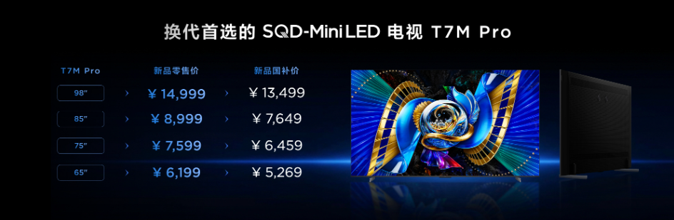 如果说硬核配置是T7M Pro的硬实力,那亲民定价就是它征服市场的王炸杀手锏。这款机型覆盖了65、75、85、98英寸全尺寸,不管是小户型客厅还是大平层,都能选到合适的尺寸,最关键的是,国补后入门价直接下探到5千元档。可以说,SQD-Mini LED普及元年真正到来了。