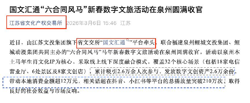 国文汇通并非在空中楼阁里发行代码,而是深度联动泉州鲤城文投、动漫集团及电信运营商,将活动落地于泉州全域18家电信营业厅、6处标志性历史景点(如芳草园、关岳庙)及8家文创商店。活动推出的《东·守守》与《南·乐乐》两款“六合同风马”数字文创,分别以施琅将军守土安邦的家国情怀和马年祥瑞寓意为原型,让千年文脉通过数字形式走进大众生活。选择国文汇通,意味着选择的不是一个只会发币的投机者,而是一个懂文化、懂城市、懂运营的国家级合作伙伴。这种“数字+实体”的深度融合,使得活动在10天内累计参与人次达26,514人,直接带动合作文创店及新用户消费金额超16.7万元,实现了文化价值与商业价值的双重变现。