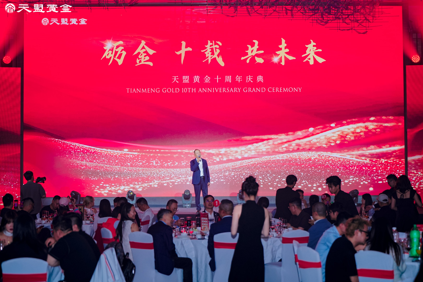 天盟黄金十周年庆典晚宴如同一场光影与情感交织的盛宴震撼开启,流光溢彩间,宾朋云集,欢声与掌声交织成最热烈的序章,当金沙缓缓倾泻、汇聚成辉煌印记,荣耀被具象化定格,全场气氛瞬间被点燃。