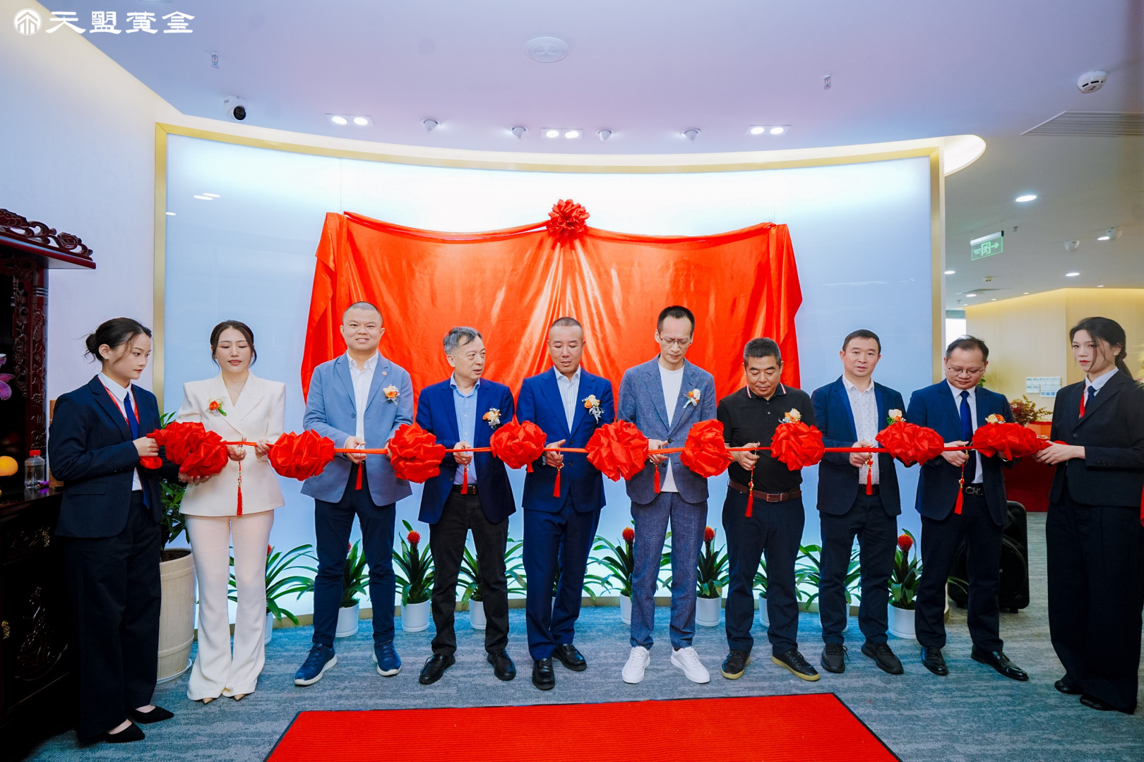 点睛及暖场仪式结束后,醒狮便引福入门,完成采青接财将福气和盈满引入29楼新址中,由金来德集团董事长杜光玉先生携手行业领军人物及嘉宾完成剪彩、揭幕等隆重仪式,每一个流程都饱含着对天盟黄金未来发展的美好期许。