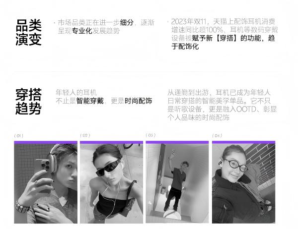 我们前期也做了大量的市场调研和用户洞察,观察到一个现象:现在年轻人手里基本都有两三副耳机,运动一副,通勤一副,出门OOTD还要搭配一副,不同场景下使用的耳机是不一样的。