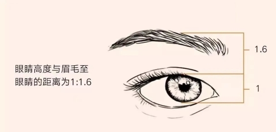 「眉眼间距」是指眉毛下缘到上睑睫毛根部的距离。根据黄金分割比例,最佳的眉眼间距与眼睛高度的比例约为1.6:1。