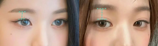 而眉眼比例在1.6:1~1:1 之间都算协调,但一旦小于1:1,就属于眉眼间距过近,容易影响双眼皮呈现的效果和面部整体气质风格。