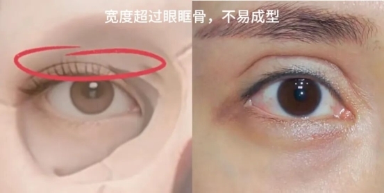 ①宽度不能太宽。因为眉眼间距近的人通常眼眶骨较低,如果双眼皮宽度超过眼眶骨,则不容易成型,还会显臃肿。