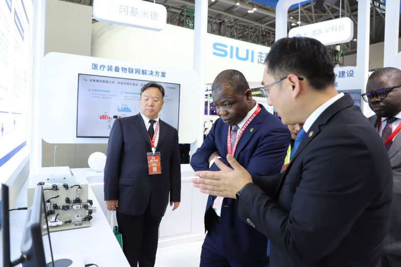 ▲ 巴西、布基纳法索使馆代表一行莅临柯渡展台参观交流大会同期,柯渡医学科技发布会隆重举行,多位行业领袖与医院专家共同见证柯渡四大重磅事项现场发布。