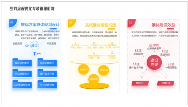 项目主动搭建业务流程优化专项机制,从业务切片分析到效果检验,形成了一套完整的闭环管理体系。同时,选拔精通业务的专家人员组成专攻团队,每日整理服务困难场景,为后续的问题解决奠定了坚实基础。在面对平台功能侧问题时,专家人员亲力亲为进行操作试点,从多个方面进行问题规整;面对业务问题,协同质量部门开展录音复盘会,聚焦无解TOP场景问题,采集客户需求,进行合理化需求排序。