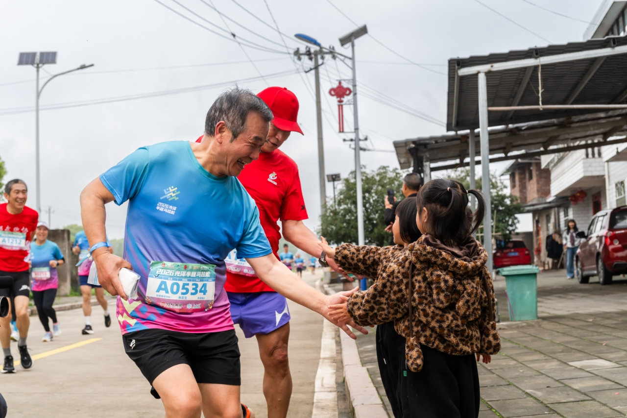 赛道两侧,热情的村民敲起锣鼓,孩子们挥舞着自制的小旗子,喊着“加油加油”。700余名志愿者分布在各岗位,从赛前的一对一咨询服务,到比赛当日的60辆大巴统一摆渡,再到30台移动AED与医疗跑者、沿途医疗站构筑的立体保障网络,每一个环节都让人安心。