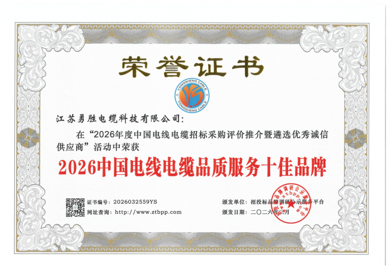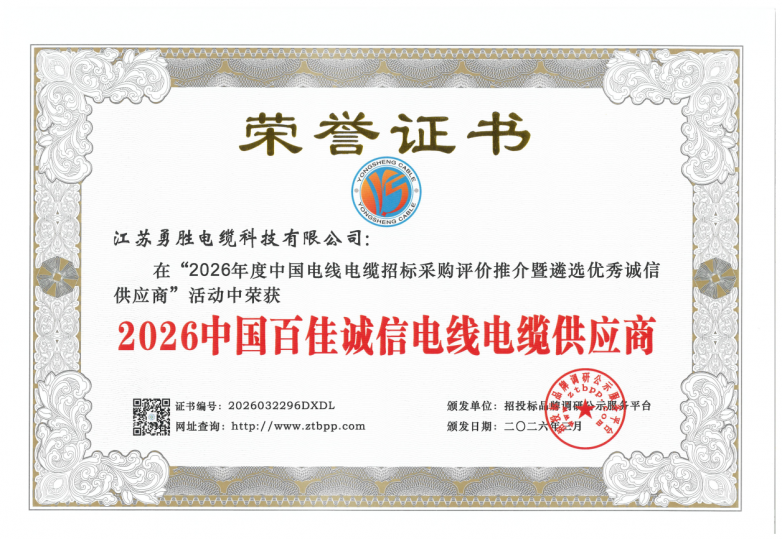 站在新的发展起点,江苏勇胜电缆将以此次荣誉为契机,坚守“诚信、专业、优质、高效、务实、创新”的经营理念,持续深耕线缆领域,不断提升产品品质与服务水平,与各行各业用户携手共进,为我国新型电力系统建设与国民经济高质量发展贡献更大力量。