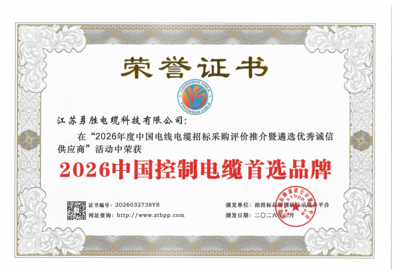 近日,在招投标品牌调研公示服务平台举办的“2026中国电线电缆招标采购评价推介”活动中,江苏勇胜电缆科技有限公司凭借过硬的产品品质、完善的服务体系与良好的行业口碑脱颖而出,一举斩获“2026中国百佳诚信电线电缆供应商”“2026中国电线电缆品质服务十佳品牌”“2026中国控制电缆首选品牌”三项重磅荣誉,用实力展现企业综合素养,为线缆行业高质量发展注入力量。
