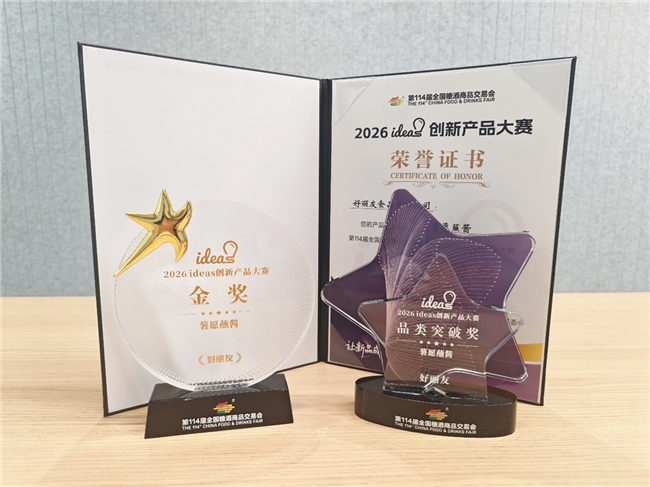近日,全国糖酒会ideas创新产品大赛颁奖典礼在成都隆重举行。在这场汇聚行业精英与前沿产品的盛会上,好丽友薯愿蘸酱系列凭借敏锐的市场洞察、卓越的创新实力与市场表现一举摘得2026 ideas创新产品大赛金奖和品类突破奖。