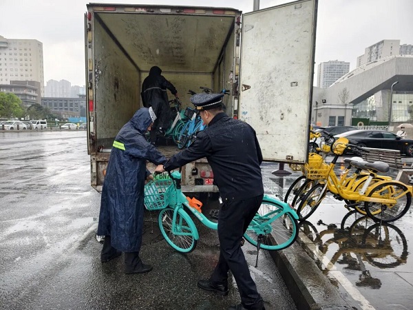 城管队员协助单车企业清运共享单车