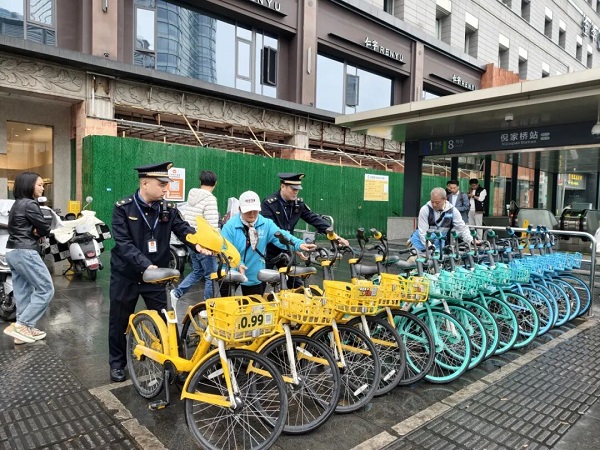 此外,武侯区综合行政执法局指导各共享单车企业组建点位保障和车辆转运两支专项队伍,实行定点值守与机动调度相结合。每个重点点位安排专人驻守,不间断开展巡查、维护与清运工作,实时掌握车辆投放与使用情况,发现堆积即刻处置,持续保持单车停放规范有序、街面环境整洁通畅。