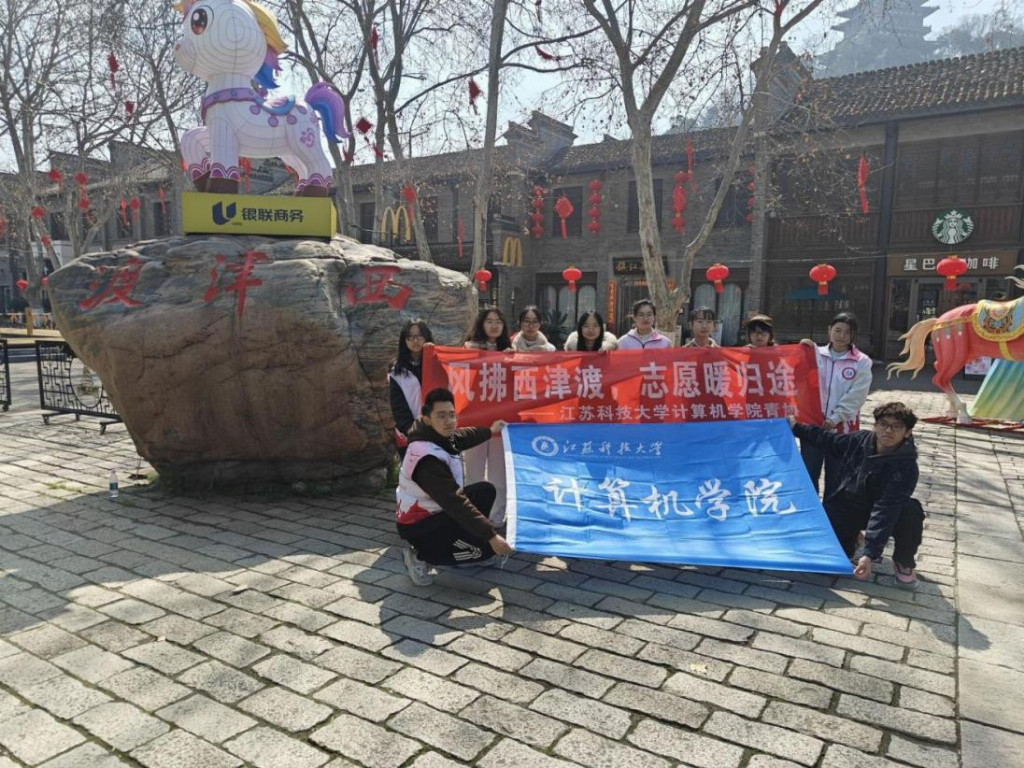 活动尾声,志愿者们来到西津渡标志性景观前,高举“风拂西津渡,志愿暖归途”和“江苏科技大学计算机学院”的旗帜合影留念。红色的旗帜在春风中舒展,与古街的青砖黛瓦相映成辉,定格下青春与志愿的美好瞬间。