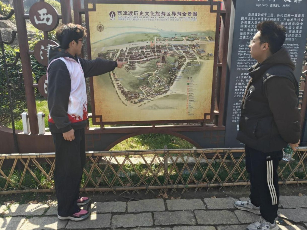 在景区导览全景图前,几名志愿者驻足研究,互相交流街区布局,熟悉主要景点和游览路线。“待诏渡”“观音洞”“救生会”……大家一边指认位置,一边讨论如何用简洁清晰的语言为游客指引方向,为后续的引导服务做准备。