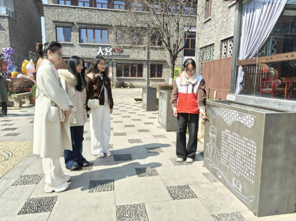 行至西津渡名人介绍牌前,志愿者们在一处展板前停下了脚步。展板上介绍的是著名语言学家、教育家吕叔湘先生(1904—1998),他是《现代汉语词典》早期主编,也是镇江走出的学术大家。几位同学围在展板前认真阅读,一位志愿者自告奋勇,主动结合展板内容,向同伴们分享起吕叔湘先生的生平故事:“吕先生是我国现代汉语研究的奠基人之一,他主编的《现代汉语词典》影响了几代人的语言规范。大家可能不知道,他早年留学英国,回国后一直致力于语文教学和词典编纂,为中国语言学发展作出了巨大贡献……”同学们听得入神,不时有人提问,大家你一言我一语,在交流中对这位镇江籍学术大家有了更深的敬意。