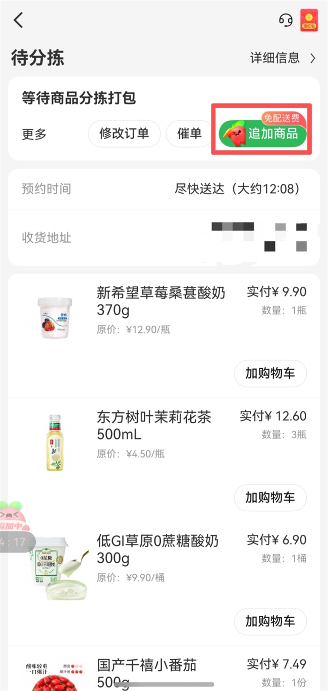 ·追加商品更省事:下单后突然想起漏买东西?不用取消重拍,5分钟内直接在订单追加,小哥一次送齐,再也不用多花冤枉钱~