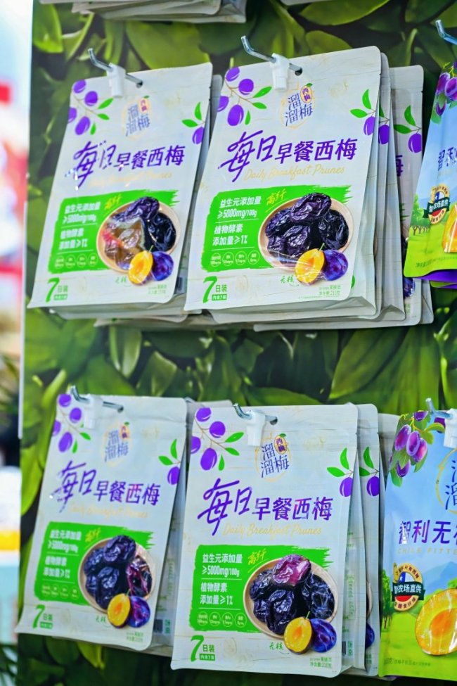 作为本次参展的核心品类,溜溜梅西梅聚焦日常食用需求,打造出三款差异化产品。智利无核西梅的原料由智利专属西梅农场直供,约4斤鲜果制成1斤西梅干,0脂肪,富含膳食纤维,作为早餐食用可助力身体保持舒适状态,兼顾营养与健康。