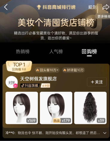 在线上渠道,天空树的销量表现尤为突出,核心奖项彰显硬实力:假发销量长期稳居抖音平台前列,更创下连续23个月蝉联天猫假发行业销量第一的佳绩;作为抖音黑标品牌旗舰店,店铺评分始终保持95分以上,凭借高性价比积累了良好口碑,同时在抖音商城美妆个护囤货店铺榜中位居TOP1,回购率表现优异。此外,旗下假发片凭借优质体验,实现连续5年全网累计销量第一,成为用户首选的假发片产品。