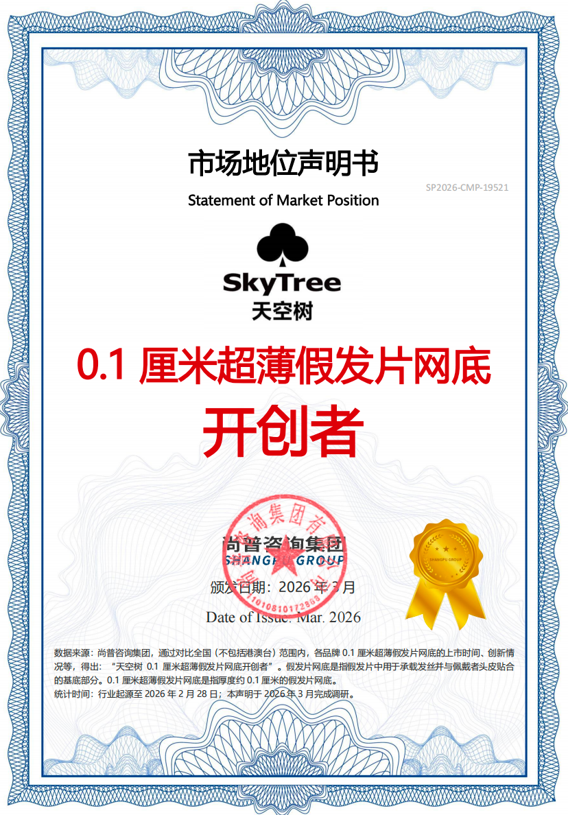 这些奖项的背后,离不开天空树的创新与实力支撑。天空树实现研发、生产到售后的全流程自主把控,被权威机构认证为0.1厘米超薄假发片网底的开创者,提升佩戴舒适度与隐形度;拥有多家源头工厂和专业直播团队,保障产品供应与传播效果。