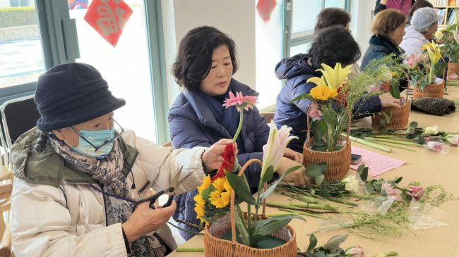 在花艺老师的指导下,居民们认真学习插花技巧,精心挑选花材、搭配色彩、修剪造型,创作出一件件独具匠心的花艺作品。现场花香四溢、欢声笑语不断,大家在轻松愉快的氛围中感受节日的温暖与生活的美好。