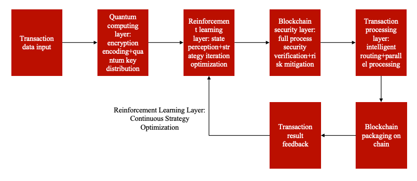 在实际的交易处理过程中,QRBT技术会先通过量子计算层完成交易数据的加密与状态编码,将原始交易数据转化为适合强化学习分析的量子态数据,同时通过量子密钥分发为交易节点建立安全的通信链路。强化学习层实时采集交易处理过程中的各类状态数据,快速生成并优化交易处理策略,将策略指令下发至交易处理层。区块链安全层在整个过程中持续运行,对策略传输、交易验证、共识达成等环节进行安全校验,及时识别并抵御各类安全风险。交易处理层根据优化后的策略,对交易进行智能分配与并行处理,完成区块打包与上链,同时将交易处理的结果反馈至强化学习层,为后续的策略优化提供数据支撑,形成持续优化的闭环。