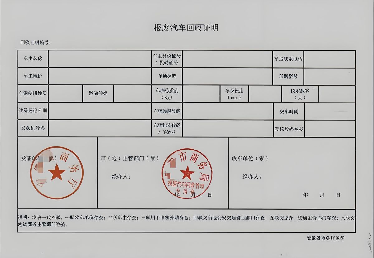 车子拆解完成之后,回收企业会在7天之内把所有需要的材料都整理好,包括《机动车注册、转让、注销登记/转入申请表》、机动车登记证书、号牌、行驶证还有《报废机动车回收证明》副本,直接提交给车管所帮你申请注销登记,全程不用你露脸。