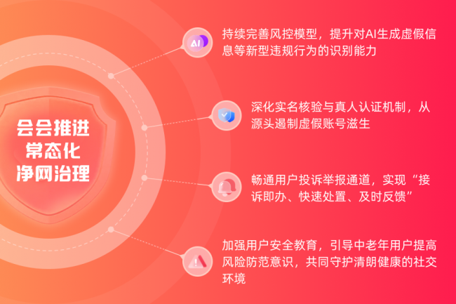 下一步,会会交友将持续紧跟国家网信办监管方向,以更高标准、更严举措推进常态化净网治理:一是持续完善风控模型,提升对AI生成虚假信息等新型违规行为的识别能力;二是深化实名核验与真人认证机制,从源头遏制虚假账号滋生;三是畅通用户投诉举报通道,实现“接诉即办、快速处置、及时反馈”;四是加强用户安全教育,引导中老年用户提高风险防范意识,共同守护清朗健康的社交环境。
