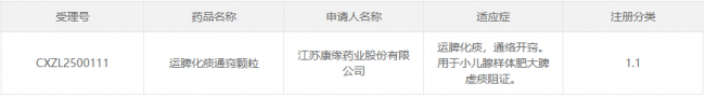 运脾化痰通窍颗粒是康缘药业开发的中药1.1类新药,功能主治运脾化痰、通络开窍。小儿腺样体肥大是儿科常见疾病,脾虚痰阻证是其中较为常见的一种证型,康缘药业该新药针对这一病症展开研究,有望为患儿带来新的治疗选择。从时间线来看,运脾化痰通窍颗粒的临床申请(CXZL2500111)于2025年11月获得承办,短短两个月后,即2026年1月就获得临床试验默示许可。如此高效的审批流程,既体现了监管部门对儿科用药研发的支持,也反映出康缘药业该新药具备较高的研究价值和潜力。
