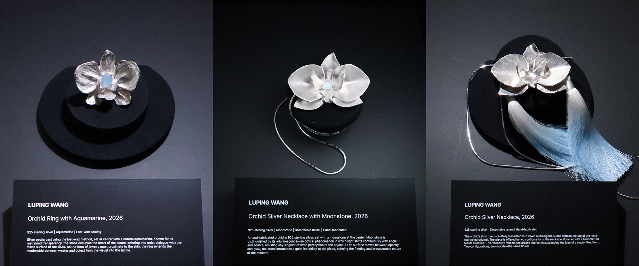 此次展出的三件作品包括蝴蝶兰项链与戒指: 以失蜡铸造与手工塑形完成, 保留材料在制作过程中的痕迹与不确定性。其中, 项链通过可替换的流苏结构引入可变的身体关系, 使作品在不同状态中呈现出不同节奏; 戒指则以放大的花体比例贴近皮肤, 强调佩戴时的视觉冲击。