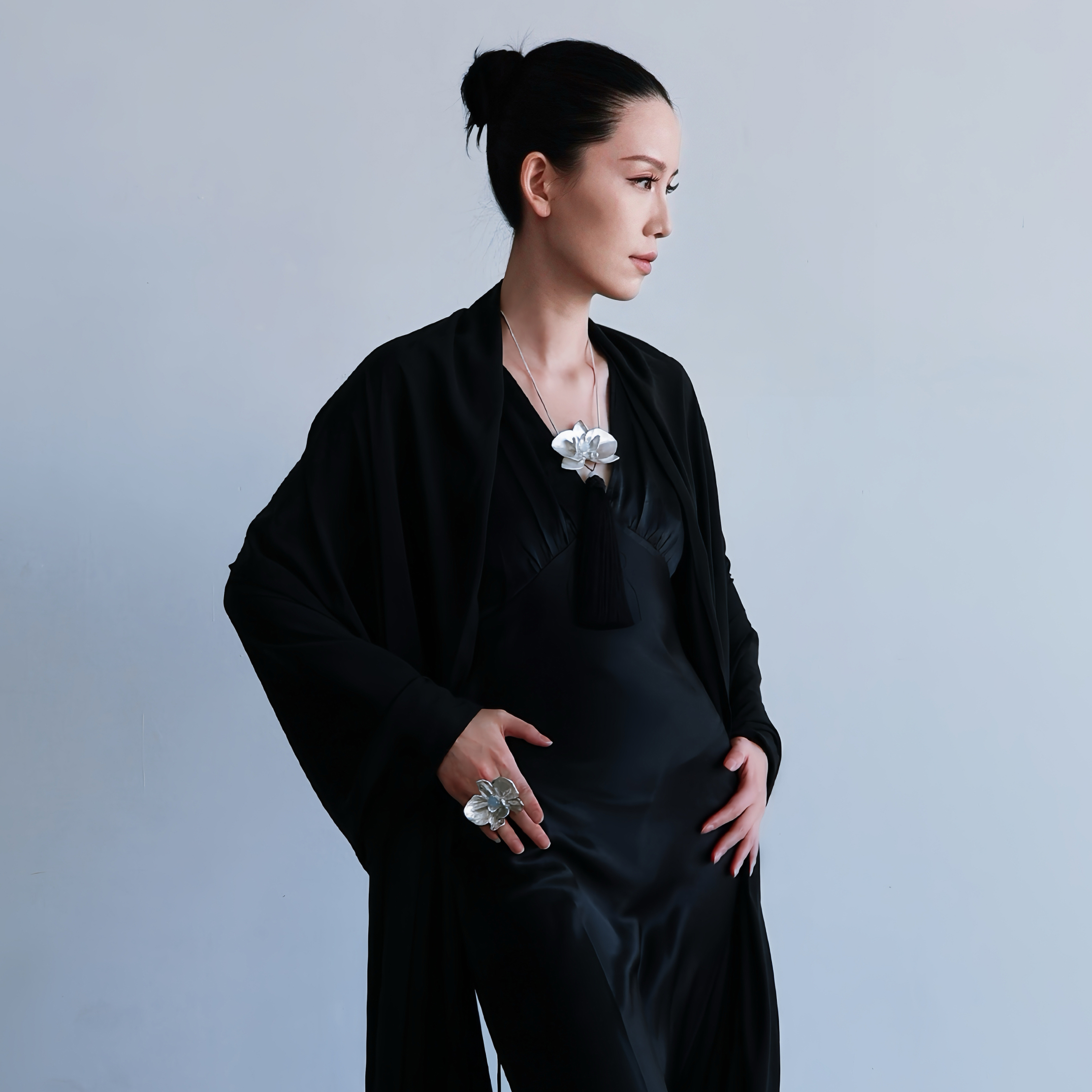 设计师王露萍佩戴着蝴蝶兰项链和戒指